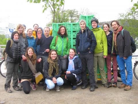 Die Aktion zum 1. Mai, bei der Solawi-Mitglieder das Gemüse mittels Fährrädern und (Lasten-)Anhängern von Kirchvers nach Marburg und Gießen transportieren, fand 2017 schon zum fünften Mal statt. Und, das muss hier betont werden, sonst war das Wetter immer viel besser! An diesem 1. Mai jedoch meinten es Himmel und Wolken leider nur bis zur Ankunft auf dem Hof gut mit uns. Beim Aufladen fing es dann an zu schütten und wurde auch ziemlich kalt. Doch die Moral ließen die Radler*innen trotzdem nicht sinken. Hoch beladen mit Kisten voller Möhren, Radieschen, Salat und Pak Choi (eine asiatische Kohlsorte) rollten die beiden Carla Cargos (große Lastenanhänger mit Motorunterstützung) sowie die Begleitmannschaft an ihre Bestimmungsorte. Eine besonders fiese Steigung musste gemeinschaftlich bezwungen, einige Mai-Bollerwagen-Touren aus dem Weg geklingelt werden. Doch am Ende kamen Gemüse und Transporteur*innen sicher in Marburg und Gießen an. Von hier aus traten Radieschen & Co. ihre letzte Etappe an. Fleißige und vom Regen nicht klein zu kriegende Solawi-Mitglieder organisierten den Transport an die Verteilpunkte.