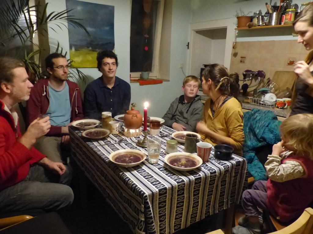 Zur Vorspeise gab es bei Cécile und Nina eine lila Gemüsesuppe, die aus der frischen Lieferung vom Donnerstag zubereitet wurde. Besonders schön war, dass Ninas 2 jährige Tochter Mathilda mit am Tisch saß und uns alle gebannt hat. Jörg brachte ebenfalls seinen Sohn Milan mit und so wuchs die Runde von sechs auf acht Personen, die allesamt genüsslich die Suppe mit selbst fermentiertem Sauerkraut aßen. Zur Hauptspeise hatten Rita und ich es nicht weit. Wir mussten nicht einmal das Haus verlassen, sondern lediglich 2 Stockwerke tiefer gehen zu Clara in die WG. Hier gab es eine Reispfanne mit (ebenfalls) Solawi Gemüse. Es war schön zu sehen, wie man aus dem gleichen Gemüse 2 komplett unterschiedliche Gerichte zubereiten konnte. Die Hauptspeise war auch sehr lebhaft und so konnten wir uns schwer lösen, um zur Nachspeise zu fahren. Bei uns gab es dann den schon erwähnten Milchreiskuchen. Dazu Ritas eingemachte Zwetschgen waren einfach köstlich! Bei mir verweilten wir auch eine Weile und konnten uns über den Abend unterhalten, hatten aber auch hitzige, politische Themen am Tisch.