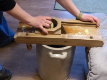 Wie funktioniert das nun? Einfach mal anfangen! So kamen erfahrene Sauerkraut-StampferInnen und mutige Interessierte zusammen und stellten ihre eigene Kreation her. Eine elektrische Schneidemaschine war mitgebracht, sie blieb aber in ihrem Karton: Handarbeit war hier der größte Spaßfaktor. Messer oder Hobel? Auf's Brett, oder direkt in den Topf oder das Glas? Das Salz abgewogen, nach Gefühl hinzugefügt, mit dem Stampfer eingearbeitet, oder mit den bloßen Händen? Ausprobieren war angesagt. Ein großer Gärtopf aus Ton wurde zum „Sammeltopf“, jedeR konnte einmal mit dem großen Schlitten das Kraut hobeln. Darin wurde im Großformat gestampft und Sauerkraut konnte für jedenN abge füllt werden. Weitere Krautarten, Möhren und Rote Bete wurden separat geraspelt und geschnibbelt und so kamen am Ende einige bunte Töpfe zusammen.