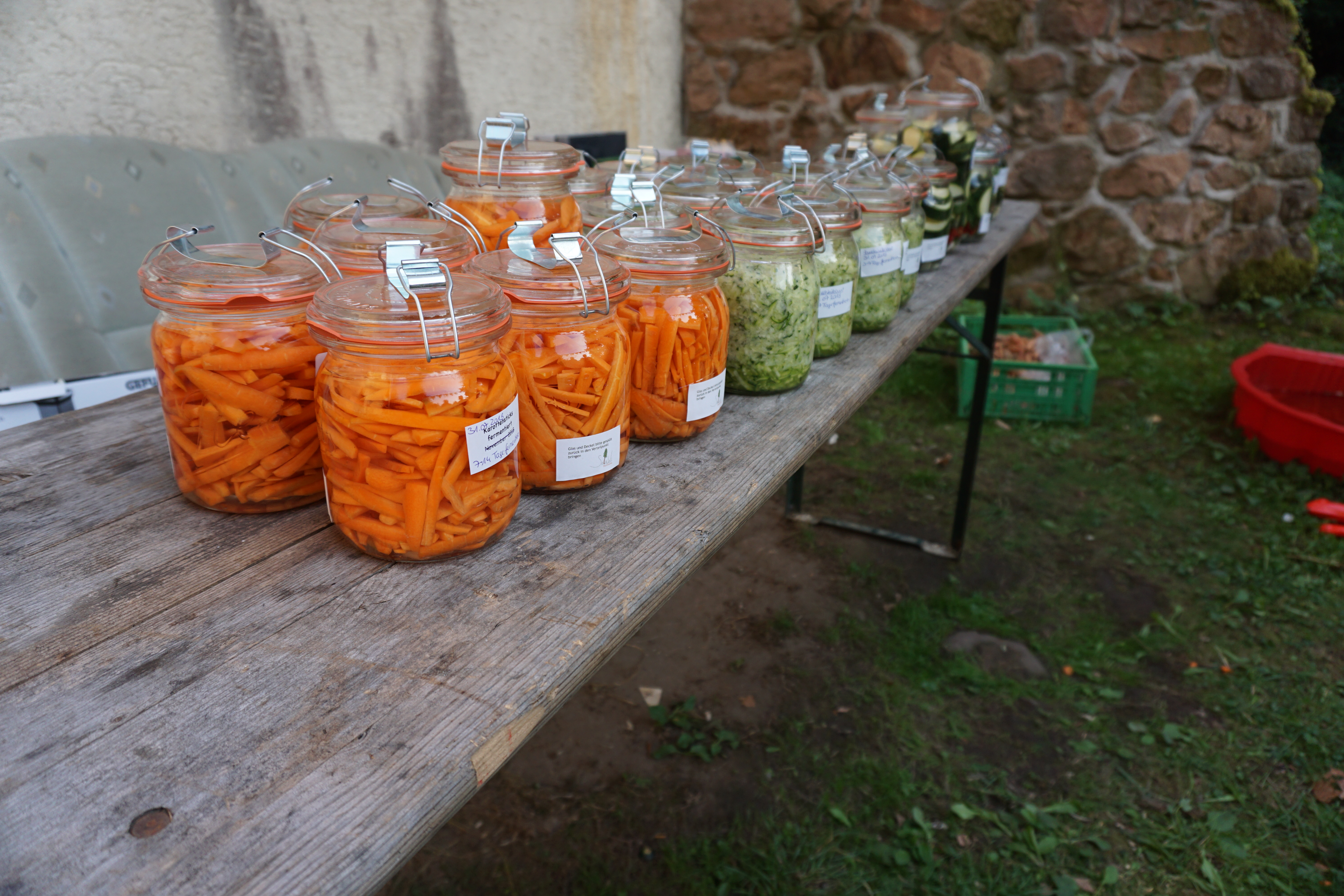 Druch das Verarbeitung wurden die angenagten Teile rausgeschnitten und das Gemüse für längere Zeit haltbargemacht, ohne lange Kochvorgänge. Trotzdem waren wir eine Weile beschäftigt, aber hatten eine gute Zeit bei Sonnenschein im Garten.