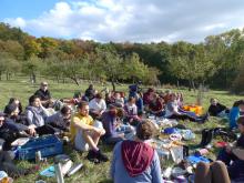 Bei sonnigem Wetter und angenehmen Temperaturen fanden sich zeitweise über dreißig Leute auf der Wiese ein! So ging das Ernten beinahe 'wie von selbst' und hat viel Spaß gemacht - wozu natürlich auch das gemütliche Picknick beitrug. Selbst unser Kompostklo aus dem Vorjahr tat noch einmal gute Dienste.