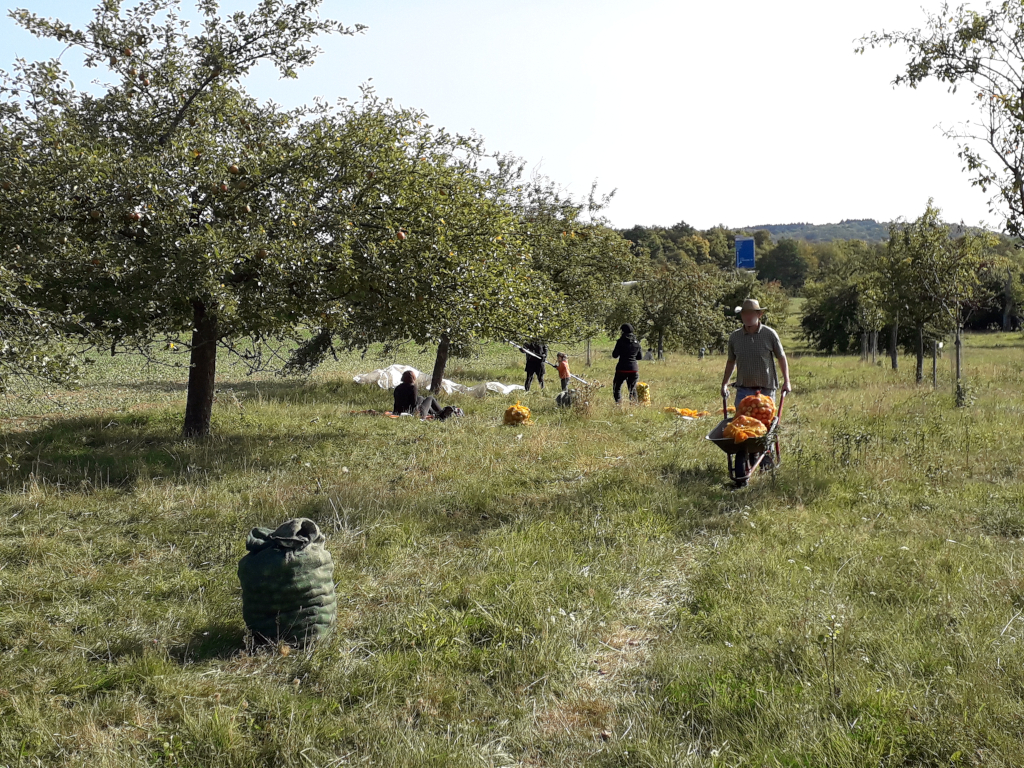 Auf den Streuobstwiesen werden gerade wieder die Äpfel und Birnen reif, und so fand am Samstag, dem 19. September die erste große Ernteaktion dieser Saison statt. 10 Leute sammelten und pflückten in Gießen-Wieseck, und 20 waren in Heskem dabei. Etliche Kinder hatten auch ihren Spaß, vor allem konnte man wunderbar auf Bäume klettern! Was für die Landwirtschaft gerade ein Problem ist, kam uns an diesem Tag zugute: Es war trocken, sonnig und warm - bestes Erntewetter! Und es kam mehr zusammen, als wir erwartet hatten: An Saftobst rund 1,6 Tonnen, davon gut 1 Tonne aus Wieseck, und dazu rund 30 Kisten Tafelobst aus Heskem. Das Saftobst haben wir abends in Niederweimar keltern lassen, und am Ende konnten wir neben dem Tafelobst 187 5-Liter-Saftboxen im Verteilpunkt Oberstadt einlagern. Sowohl bei der Ernte selbst, als auch beim Saftpressen und beim Einlagern haben stets soviele Hände mit angepackt, dass alles recht entspannt und rund lief.
