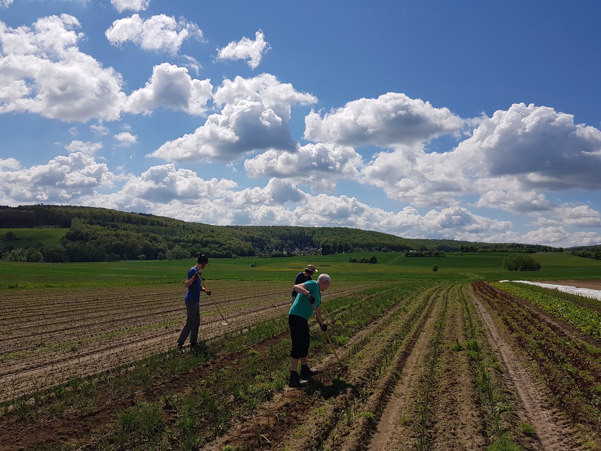 Bei mal wieder schönstem Sonnenschein, abgelöst von spannenden Wolkenformationen, fand der Ackereinsatz im Mai statt. Da wir so viele waren (13 Menschen insgesamt), konnten wir uns aufteilen. Die eine Gruppe blieb mit Mitarbeiter Chris in der Nähe von Kirchvers auf dem größten Acker, die andere Gruppe fuhr zu einem Acker ein Stück außerhalb des Dorfs. Dort stehen die gelben und roten Zwiebeln und einige Lauchwiebeln, dazu Schalotten (die sind neu im Angebot!) und Rote Bete. Um all diese Pflanzen herum hackten wir das Unkraut weg und unterhielten uns nebenbei auch noch gut. Nach ungefähr 4 Stunden wurden wir wieder abgeholt. Die andere Gruppe hatte ebenfalls gehackt und außerdem Kohl in Mulch gepflanzt.